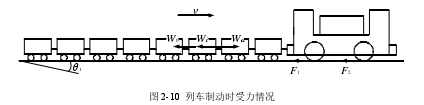 礦用電機(jī)車工作時牽引一組礦車在軌道上運行,其運動比較復(fù)雜,不僅是沿著軌道的縱向水平運動,還包括車體橫向的擺動、機(jī)車垂直方向上的跳動以及各個車體之間的相互撞擊引起的振動。然而,本文研究的是礦用電機(jī)車的制動特性,因此忽略制動時的其他運動,僅僅考慮沿著軌道水平運動,且礦車一般不帶制動裝置。在對礦用電機(jī)車整車制動狀態(tài)下進(jìn)行動力分析時,將列車看成一個整體。列車制動時受力情況如圖 2-10 所示。